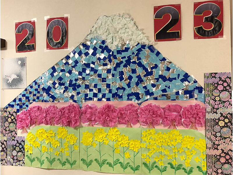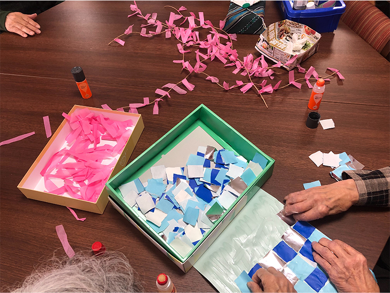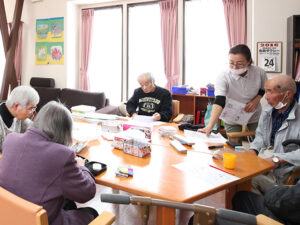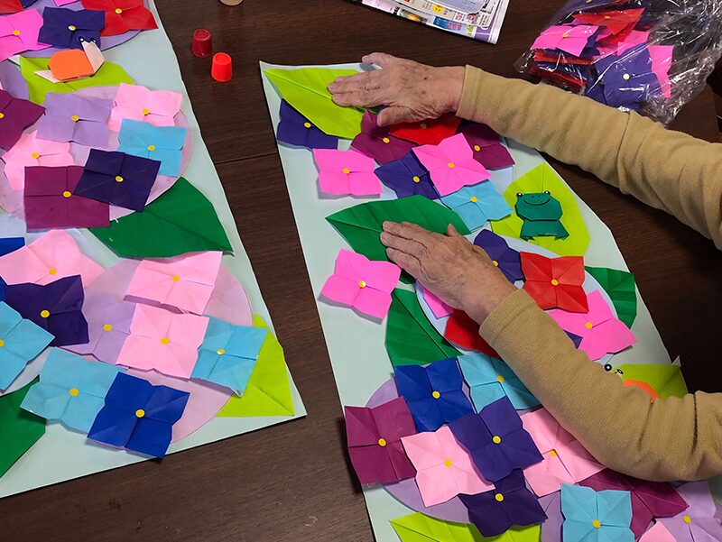 一期一会のデイ御仮屋では、『脳の活性化』『身体機能や生活の質の向上』『他者との関係作り』を目的としたレクリエーションや季節行事を行っています。旧国道沿いの窓には、季節毎にご利用者様と職員で作成した壁画を展示していますので、近くにお越しの際お立ち寄りください。